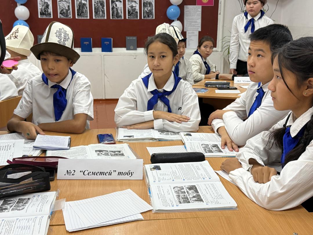 Сабактын жүрүшүндө окуучулар “Манас” эпосунун мазмуну, каармандары жана тарыхый мааниси боюнча терең маалымат алышты. Ошондой эле белгилүү манасчылар Саякбай Каралаев жана Сагымбай Орозбак уулу* тууралуу айтып өтүштү.